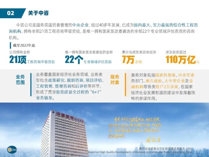 近年来,中咨公司充分发挥多学科、����� �������Ƴ������������ �������Ƴ������������ �������Ƴ������������ �������Ƴ�������跨领域的综合咨询专业优势,为中外政府和相关企业����� �������Ƴ������������ �������Ƴ������������ �������Ƴ������������ �������Ƴ�������提供“一带一路”全过程、精准化咨询服务600余项����� �������Ƴ����������� �������Ƴ������������ �������Ƴ������������ �������Ƴ�������,业务遍及100多个国家和地区。2006年以来����� �������Ƴ������������ �������Ƴ������������ �������Ƴ������������ �������Ƴ�������,中咨公司全面深度服务境外经贸合作区建设����� �������Ƴ������������ �������Ƴ������������ �������Ƴ������������ �������Ƴ�������,从相关政策办法的研究制定,到考核评价体系的建立����� �������Ƴ������������ �������Ƴ����������� �������Ƴ������������ �������Ƴ�������,再到数十家合作区的总体规划与可行性研����� �������Ƴ������������ �������Ƴ������������ �������Ƴ������������ �������Ƴ������究报告编制,多年的积累与沉淀,中咨公司已����� �������Ƴ������������ �������Ƴ������������ �������Ƴ������������ �������Ƴ�������形成较为完善的数据库与案例库,以及众多的����� �������Ƴ������������ �������Ƴ������������ �������Ƴ������������ �������Ƴ������行业专家与信息资源。