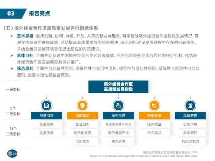 此次评价以“创新、协调、绿色、开放、共享”的����� �������Ƴ������������ �������Ƴ������������ �������Ƴ������������ �������Ƴ�������新发展理念为基本原则,建立五大领域三级指标的����� �������Ƴ������������ �������Ƴ������������ �������Ƴ������������ �������Ƴ�������综合评价指标体系,对73个境外经贸合作区在经济引����� �������Ƴ������������ �������Ƴ������������ �������Ƴ����������� �������Ƴ�������领、创新驱动、绿色生态、开����� �������Ƴ������������ �������Ƴ������������ �������Ƴ������������ �������Ƴ�������放共享、风险防控等方面的高质量����� �������Ƴ������������ �������Ƴ����������� �������Ƴ����������� �������Ƴ�������发展状况进行全面系统地分析评价,结����� �������Ƴ������������ �������Ƴ������������ �������Ƴ������������ �������Ƴ�������合新形����� ���������� �������Ƴ������������ �������Ƴ������������ �������Ƴ������������ �������Ƴ���������Ƴ�������势新要求提出����� �������Ƴ������������ �������Ƴ������������ �������Ƴ������������ �������Ƴ�������具体展望与相关建议,总结提炼合作区高质量发展����� �������Ƴ������������ �������Ƴ������������ �������Ƴ������������ �������Ƴ�������的经验做法与典型案例,测算得出“境外经贸����� �������Ƴ������������ �������Ƴ������������ �������Ƴ������������ �������Ƴ�������合作区高质量发展排名”,并最终形成《境外经济贸易����� �������Ƴ������������ �������Ƴ����������� �������Ƴ����������� �������Ƴ�������合作区高质量发展报告2023》。